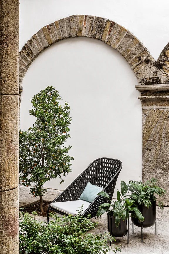 Una silla espaciosa y baja perfecta para descansar y relajarse. Combina la técnica de tejido sintético con una estructura ligera de aluminio, ideal para espacios al aire libre.